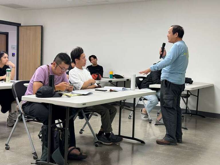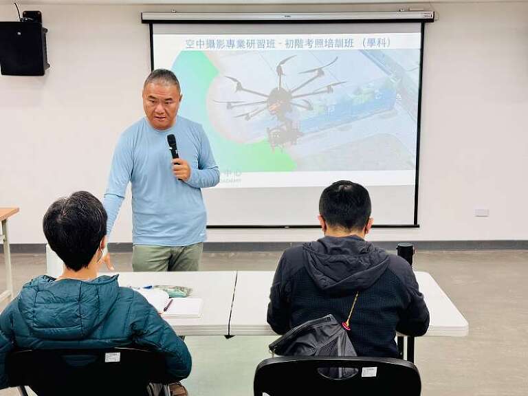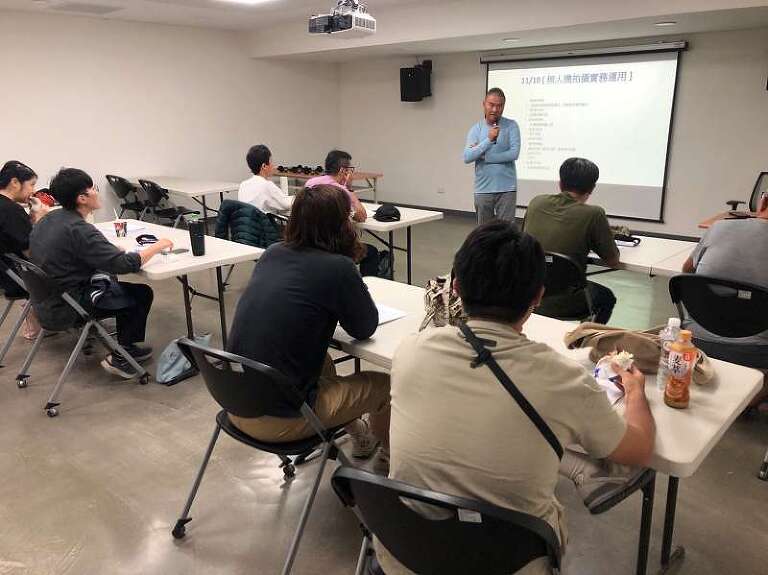 課程設計以「理論 + 實務」為核心。第一天,教官帶領學員們進行基礎認識,包括無人機的組件、飛行原理與法律規範。許多學員第一次了解到空域申請、安全操作與合法飛行的重要性,這也讓大家在心態上更加嚴謹,理解到無人機並非單純的娛樂設備,而是一項專業工具。